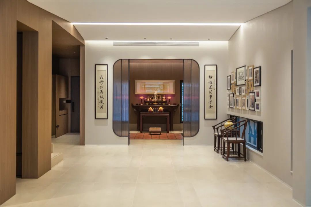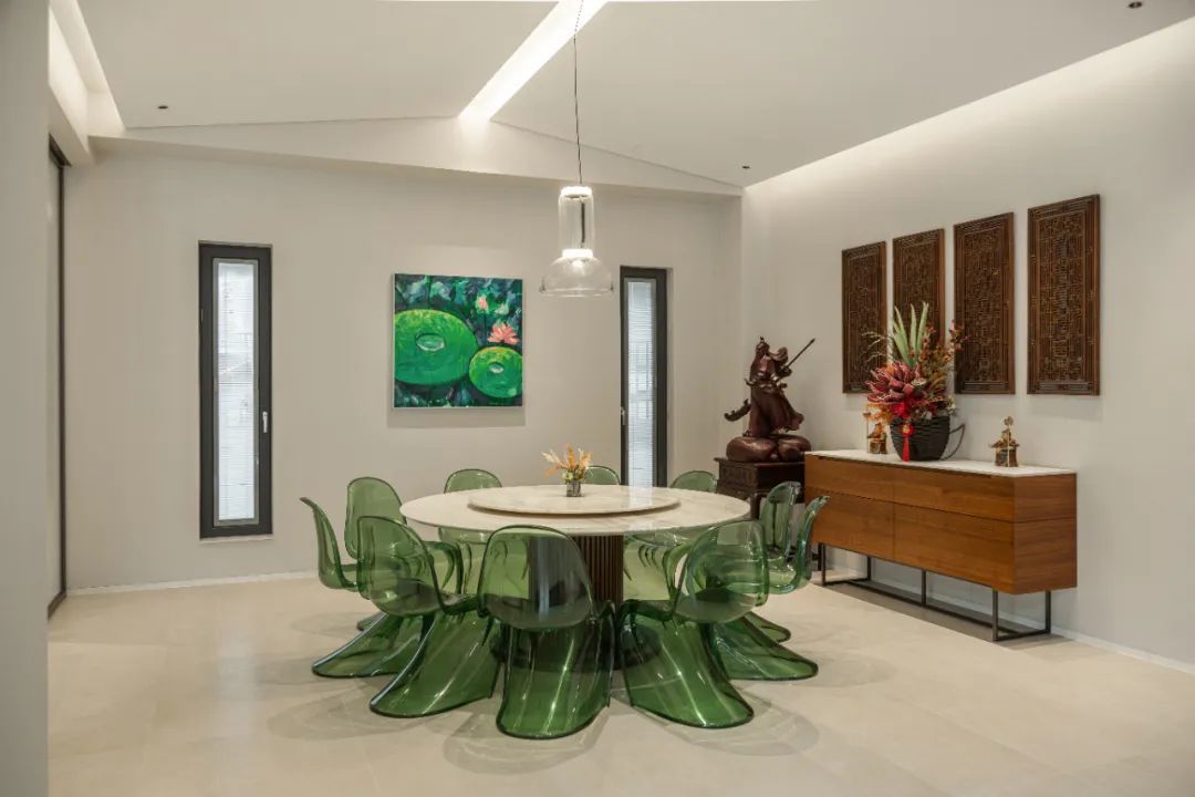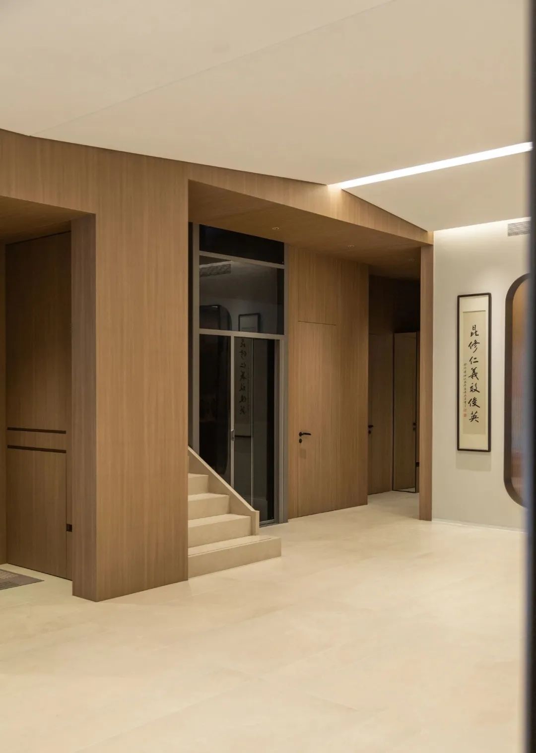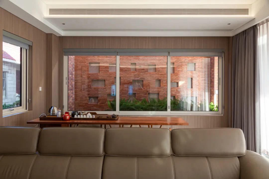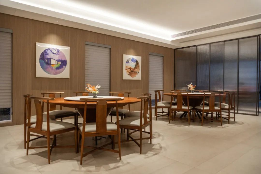 從水景走入室內,一樓有下沉式會客廳、茶室、餐廳、民俗廳,朗潤疏闊的動線,營造生活的舒適與松弛。
