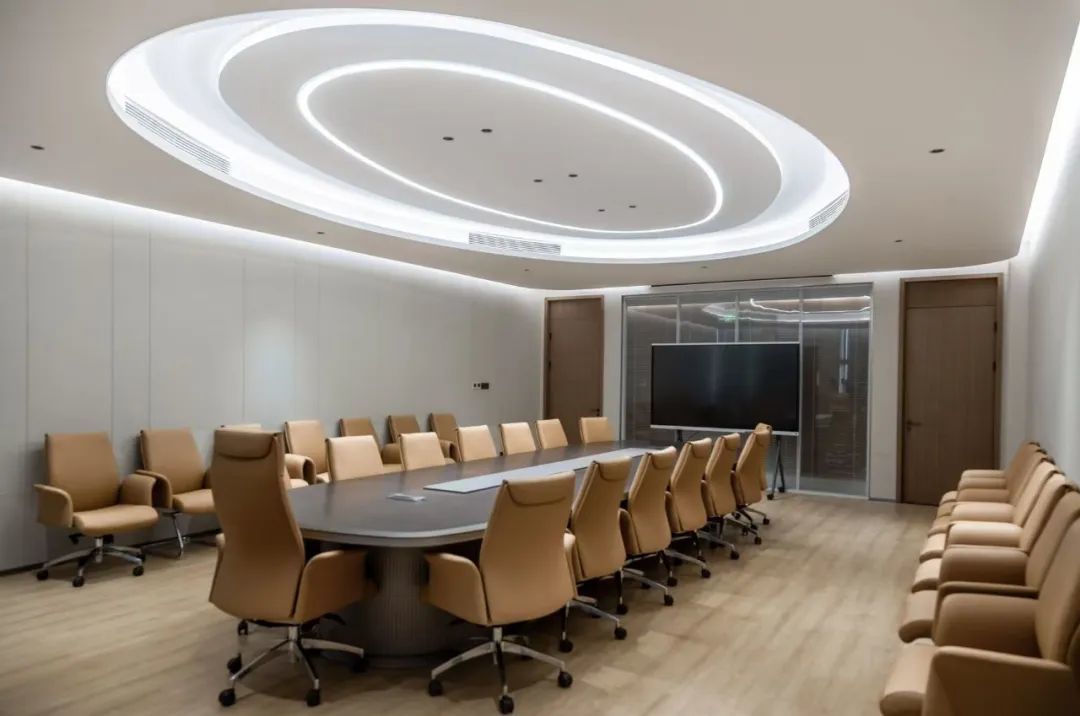 會議室天花圓弧形燈飾,增加視覺上的沖擊力,又體現了圓融的東方哲思。