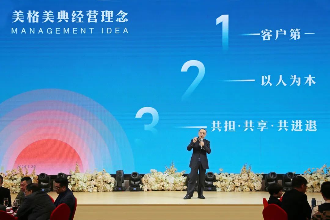 高舉酒杯,董事長陳全用“龍行龘龘,前程朤朤”,向美格家人和現場嘉賓表達誠摯的感謝、深切的祝福。