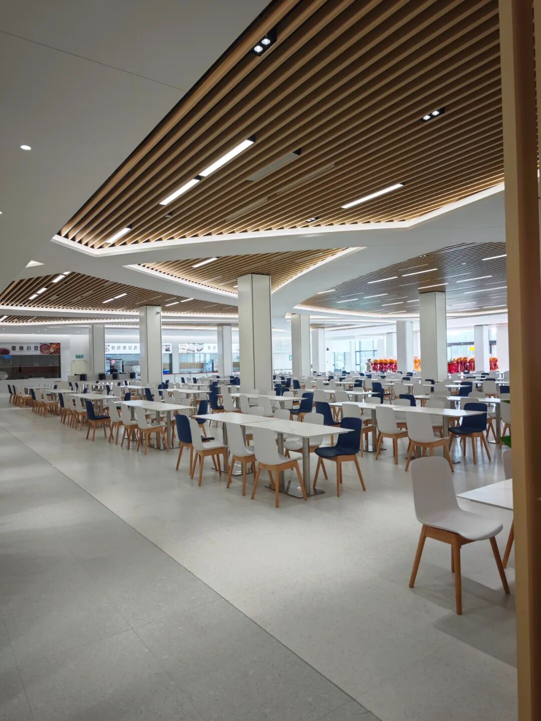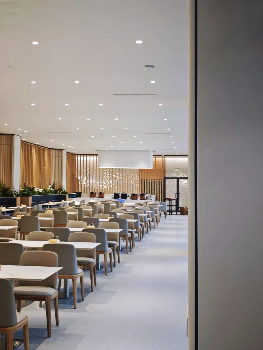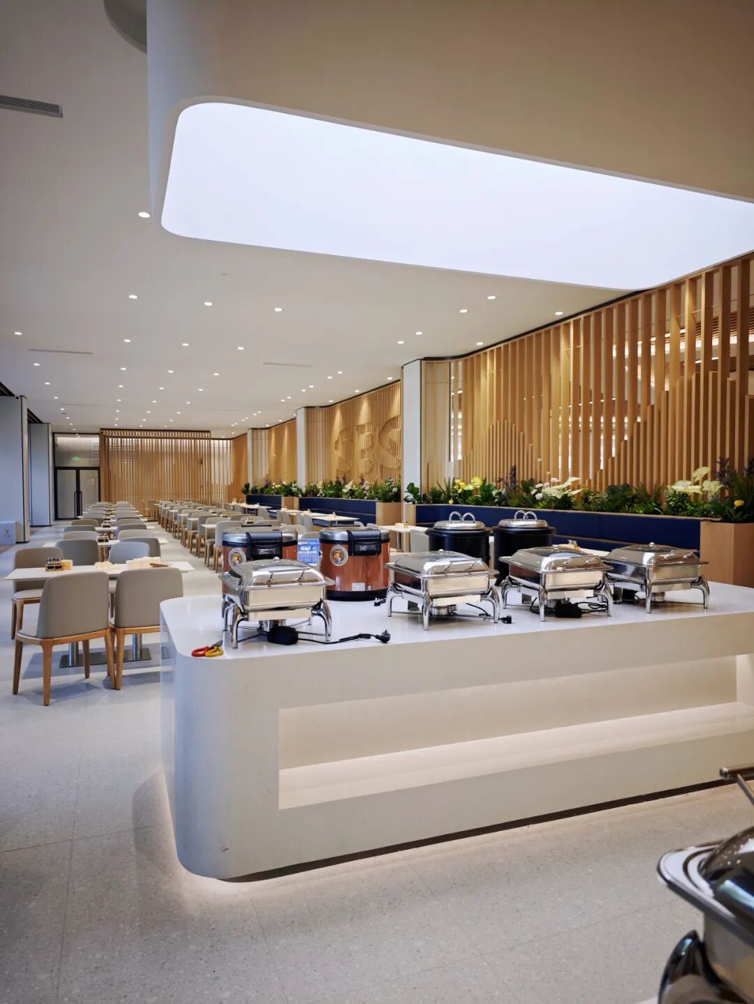 白凈餐桌、氛圍燈光、跳色餐椅,搭配融入“SBS”的格柵,創(chuàng)造了明亮活潑的視覺焦點,既提升空間質感,又讓用餐環(huán)境井然有序,在一日三餐中,增強潯興人對企業(yè)的歸屬感與榮譽感。