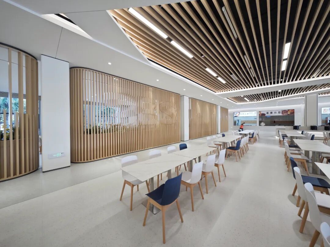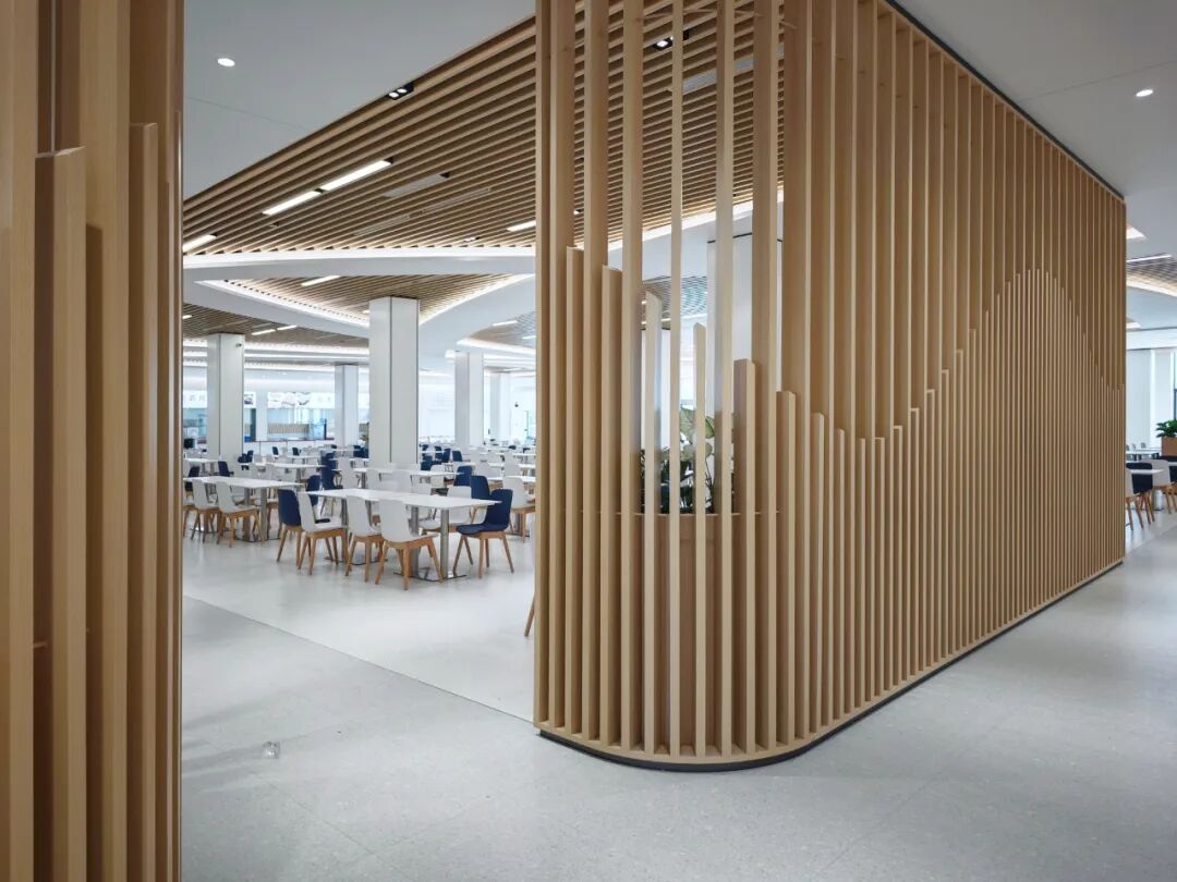 以潯興拉鏈價值觀為底色,總部餐廳整體風格現(xiàn)代簡約,幾何線條帶來的序列感,成為連貫的設計語言,與企業(yè)文化達成微妙的契合。