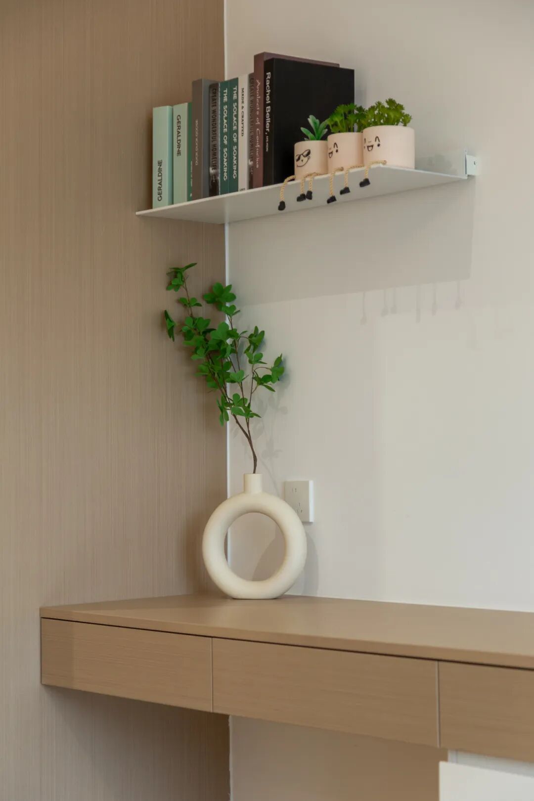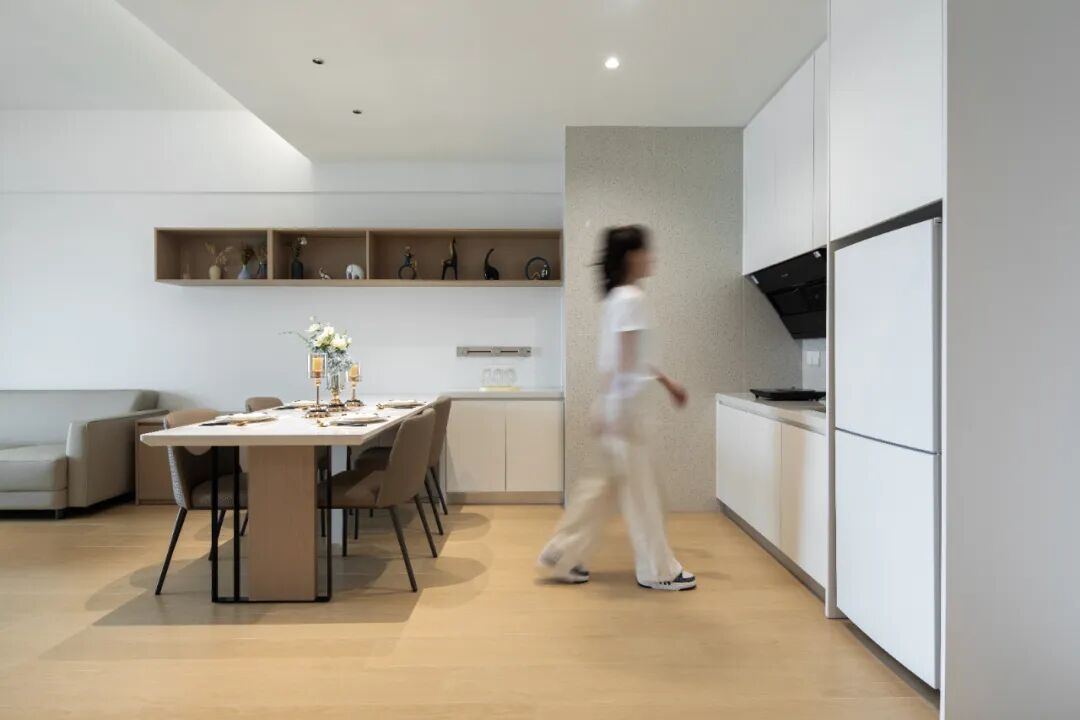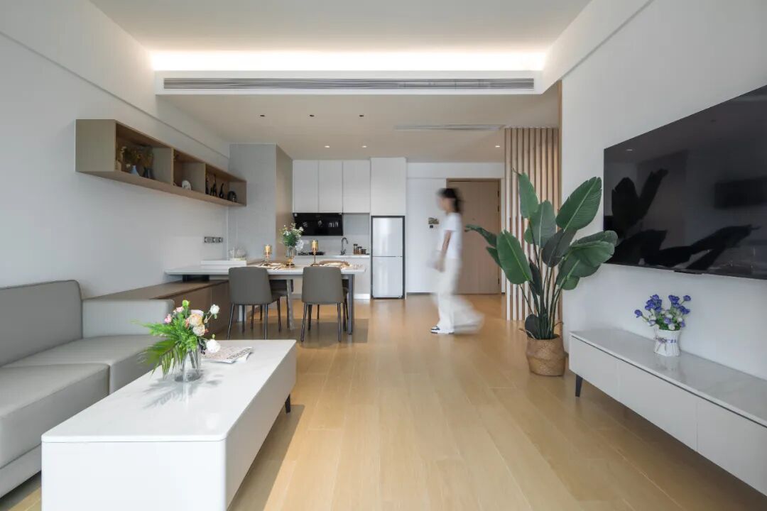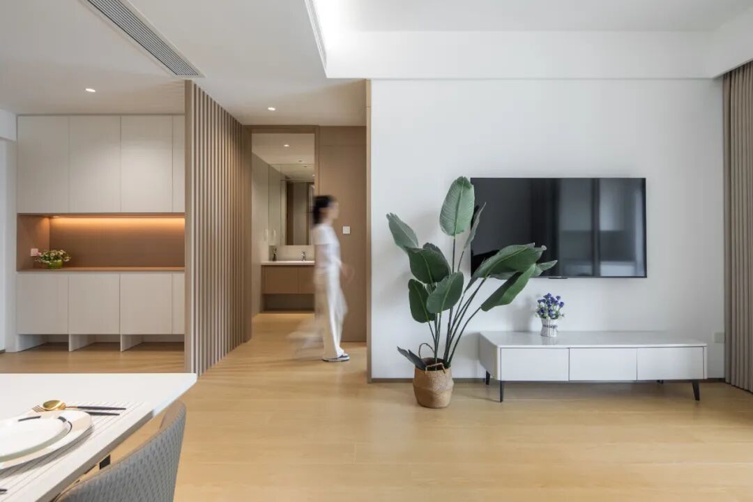 由大美整木定制的木飾面,沉穩低調,散發著溫暖自然的質感;仿白橡木木地板磚的運用,融合現代簡約與輕奢風格,提升了空間的溫馨格調。